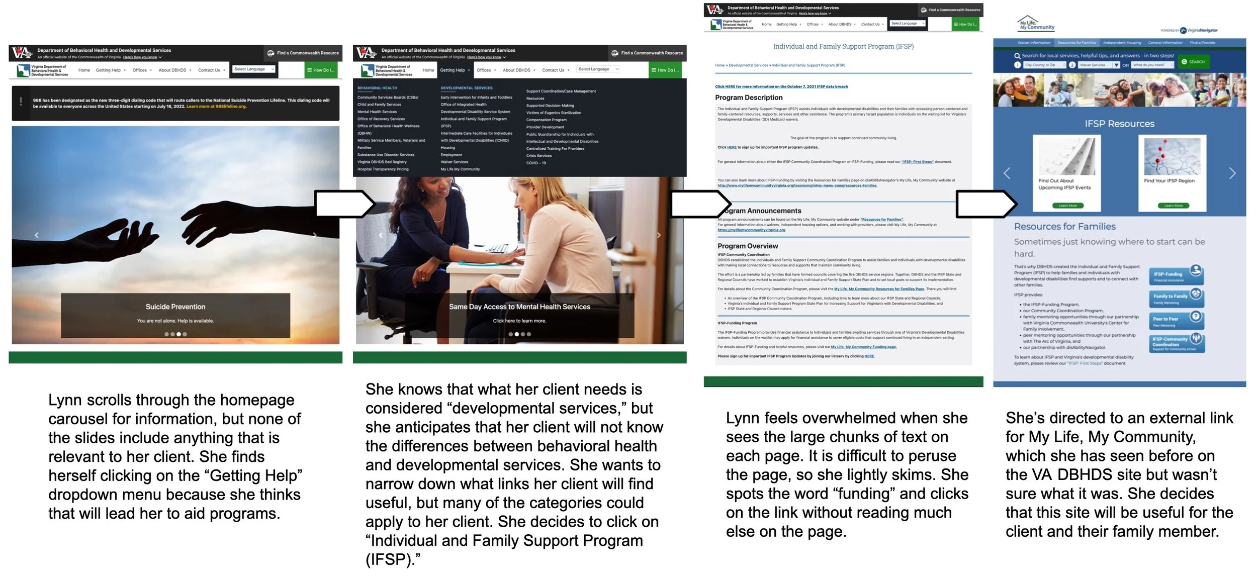 The Virginia Department of Behavioral Health and Developmental Services website poses major usability challenges, with key information buried under a complex and unintuitive interface. This not only frustrates users and wastes valuable time but also creates barriers for individuals urgently seeking critical resources and support.